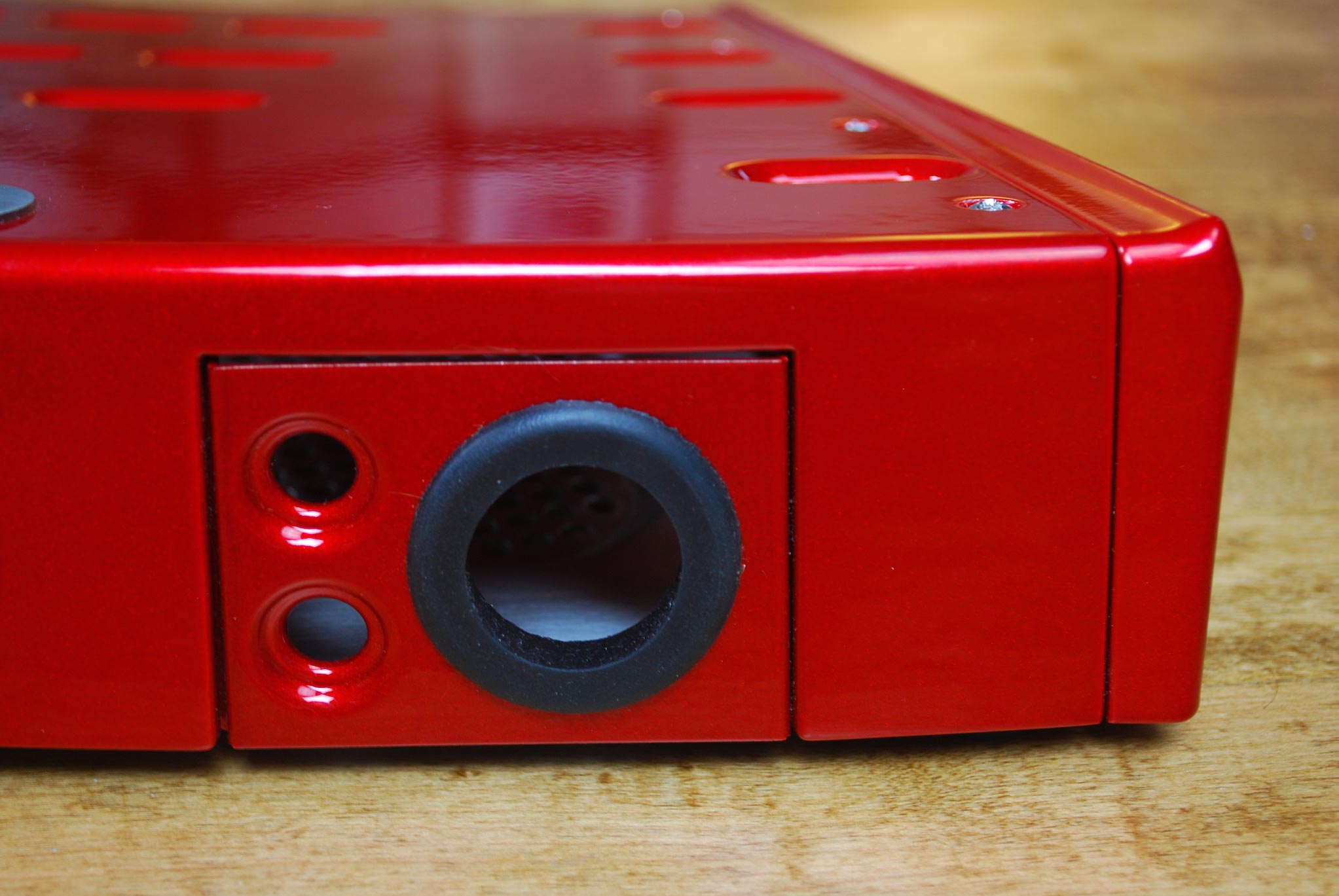 Porthole Panel includes a large 1.25″ hole with rubber grommet and holes for mounting two 1/4″ jacks. Large hole easily accommodates power cords, MIDI jacks, and other large jacks for simple wiring. Order panel matched to board color.